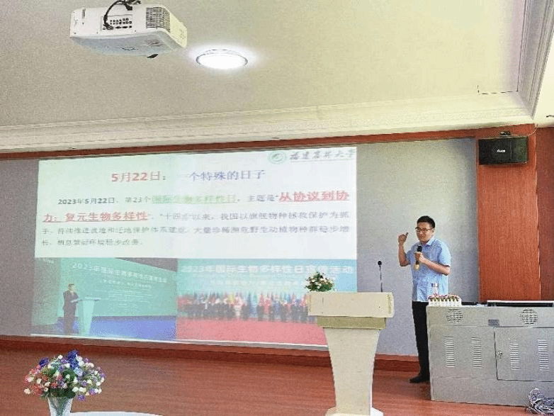 为普及生物多样性相关专业知识,倡导人与自然和谐共处的理念,2023年5月30日,福建农林大学张永强副教授应邀莅校,于外语体验中心开展“生物多样性及其保护”主题讲座。此次讲座面向学院全体师生。