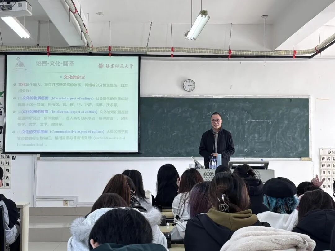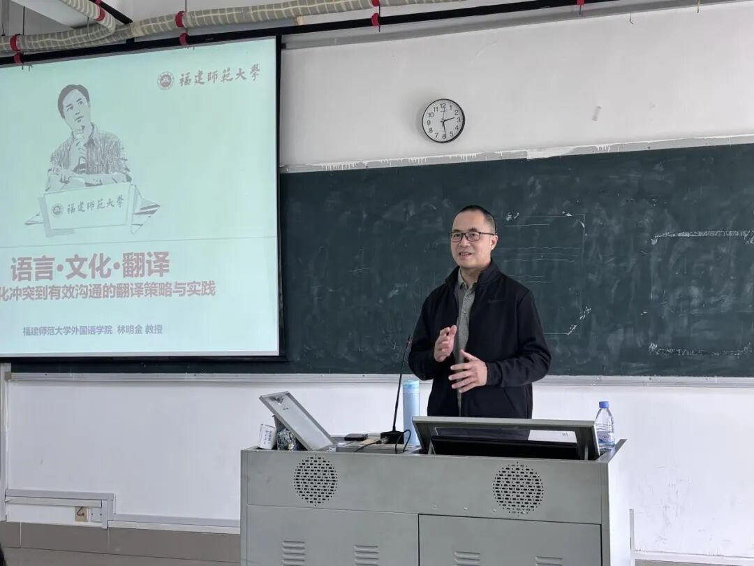 为拓展买球官网学生国际视野,提升国际传播能力,12月5日下午,福建师范大学林明金教授应邀莅临买球官网,作题为“语言·文化·翻译——从文化冲突到有效沟通的翻译策略与实践”的专题讲座。讲座由副院长童成寿主持,买球官网各年级学生代表参加了此次活动。