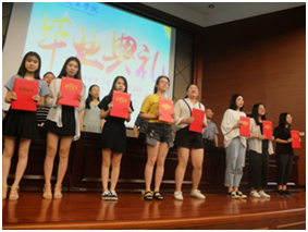 范云霞老师宣读外语系2018届毕业生情况和优秀毕业生名单。主席台上的老师们为毕业生代表、优秀毕业生分别颁发毕业证书、荣誉证书并合影留念。