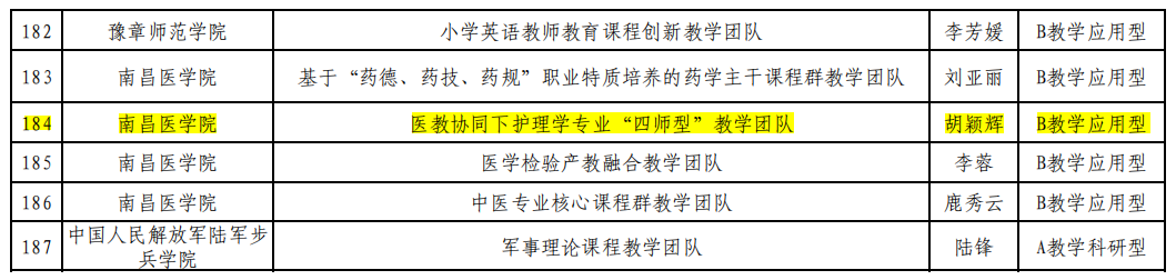 近日,江西省教育网上公示,我校beat365在线唯一官网胡颖辉教授牵头的《医教协同下护理学专业“四师型”教学团队》获得江西省高水平本科教学团队(B教学应用型)立项。2022年全省高校共评选出187个高水平本科教学团队,我校共4个教学团队获批立项建设。