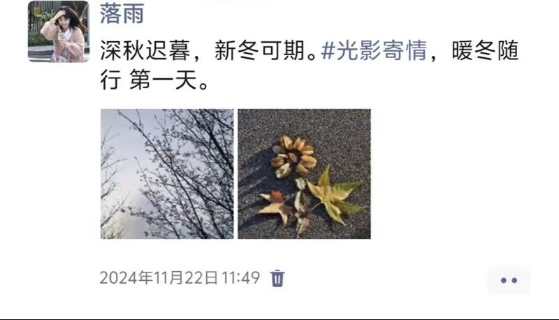2024年11月22日至24日进行了线上活动,参与活动的同学们在朋友圈分享令自己感到美好的生活照片,发现生活中的美好事物。打卡活动结束后,工作人员根据评选标准选取前30位打卡者发放了奖品。