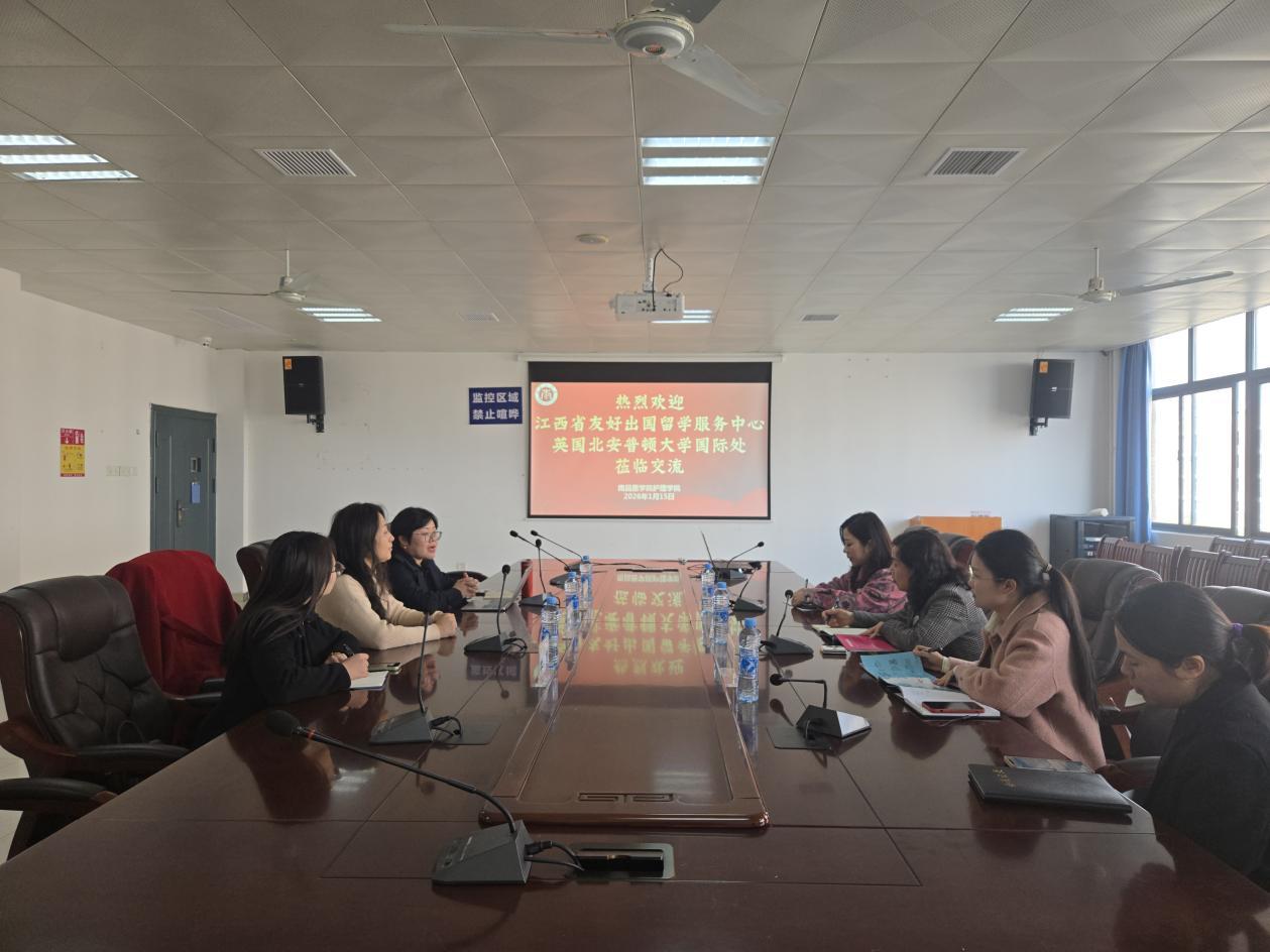 2026年1月15日,江西省友好出国留学服务中心主任丁群女士、项目经理朱梦女士陪同英国北安普顿大学国际处中国区域经理于丽娟女士来访,双方就护理学科国际合作项目开展交流。beat365在线唯一官网副院长胡颖辉、陈婧、国际合作交流中心汪露老师及相关教师出席座谈。
