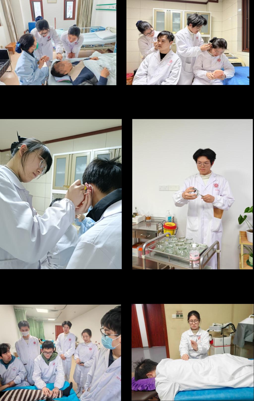 四天的轮转学习中,同学们在不同科室解锁专属“技能清单”,收获满满干货。 针灸科治疗中心是国家中医针灸临床研究中心江西省分中心。这里的“1+3+4”学科体系让同学们印象深刻。大家观摩了针灸、推拿、艾灸等传统技法,还近距离接触盆底修复的电极与磁疗技术,见证医院自主研发诊疗设备的临床应用,更沉浸式体验了长蛇灸、艾箱灸的独特魅力——看着姜末与三年陈艾绒混合后燃起的温润火力,感受“温通经络、祛寒除湿”的中医智慧,真切体会到“有温度的医学”内涵。 同学们在脑病科聚焦头面部推拿、耳穴压豆、拔罐及耳部刮痧等特色技术,在带教老师的指导下深入学习辨证施护逻辑。从根据患者病症精准选穴,到规范完成耳穴压豆操作,大家亲手实践的过程中,不仅熟练掌握了操作手法,更读懂了中医“辨证论治”的精髓。