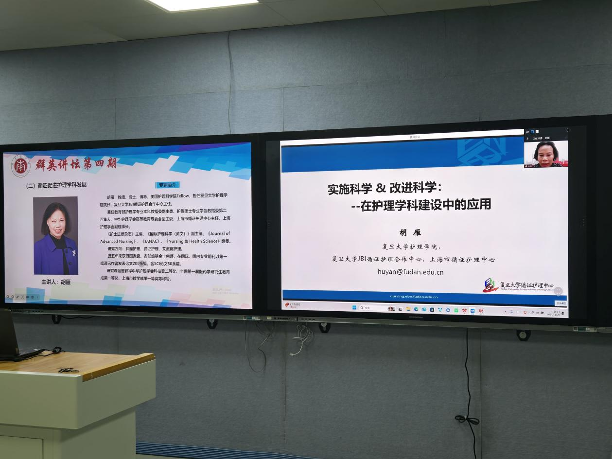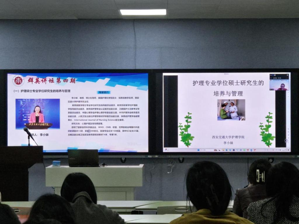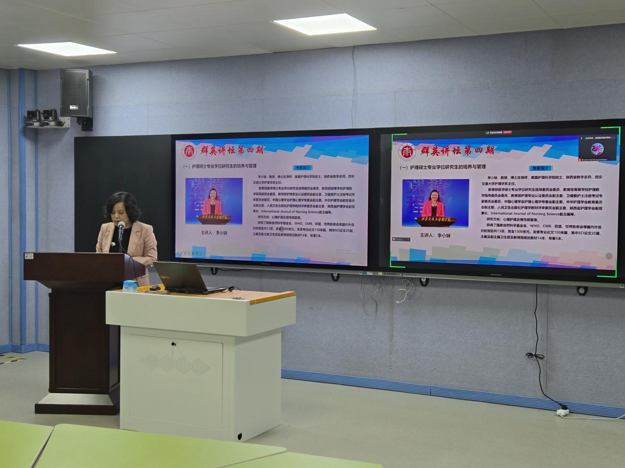 2024年11月20日下午,第四期“群英讲坛”学术讲座在beat365在线唯一官网1号实训楼411智慧教室顺利举行。本次讲座特邀西安交通大学护理系主任李小妹教授、复旦大学beat365在线唯一官网院长胡雁教授作专题报告。beat365在线唯一官网和附属医院师生线上线下共计200余人参加学习。讲座由beat365在线唯一官网副院长胡颖辉主持。